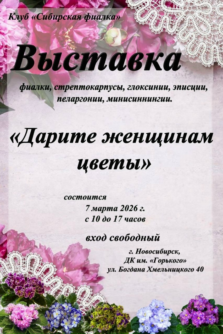 Выставка фиалок. Можно получить консультацию по выращиванию фиалок или приобрести понравившейся цветок. Вход свободный.