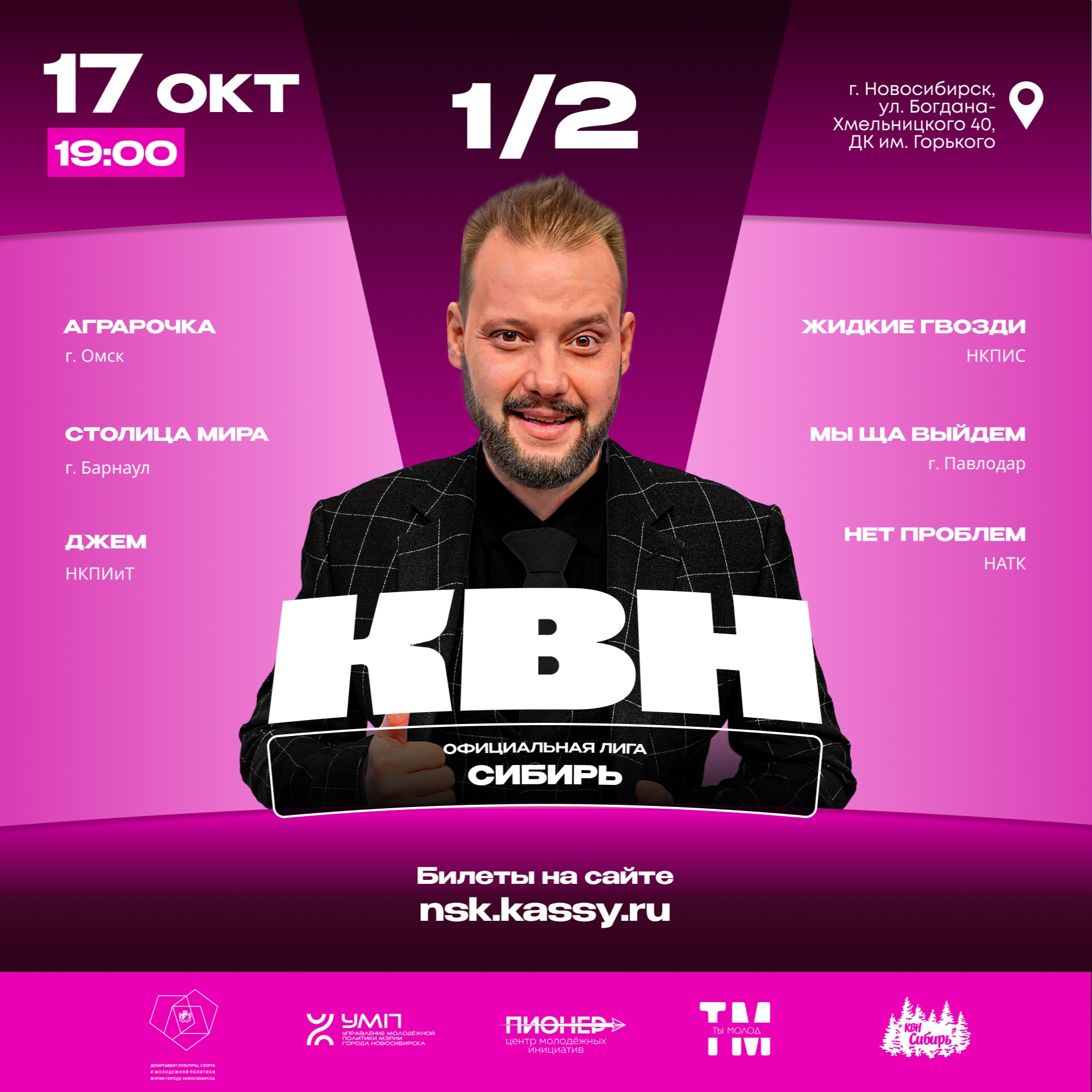 Афиша Афиша КВН-СИБИРЬ17.10.2025. Начало: 19-00Игра КВН- СИБИРЬ. Вход по билетам.Подробности мероприятия