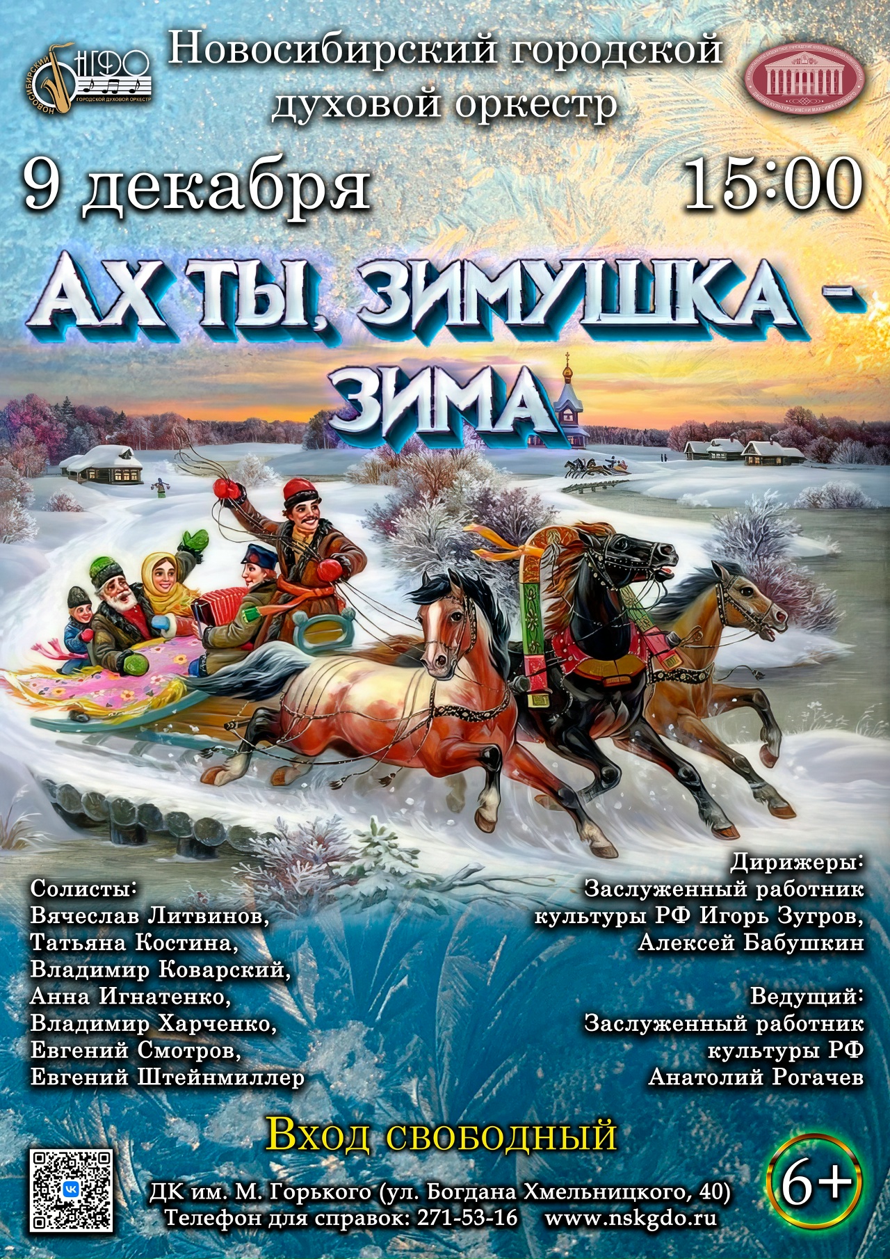 Афиша Афиша Концерт "Ах ты, Зимушка- Зима"09.12.2025. Начало: 15-00Концерт новосибирского городского духового оркестра.Вход свободный.Подробности мероприятия