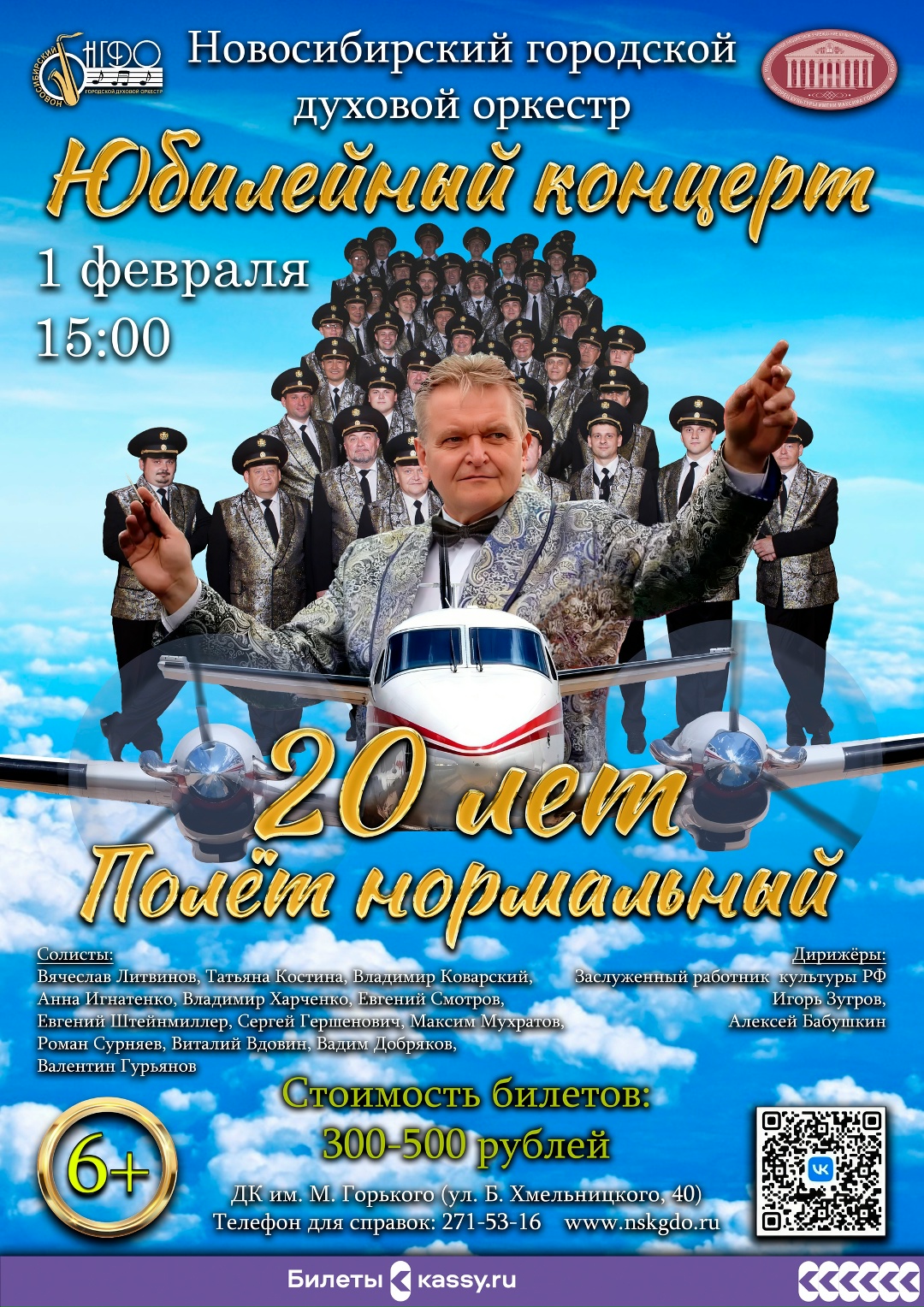 Афиша Афиша Концерт "20 лет-полет нормальный!"01.02.2026. Начало: 15-00Юбилейный концерт новосибирского городского духового оркестра. Вход по билетам.Подробности мероприятия