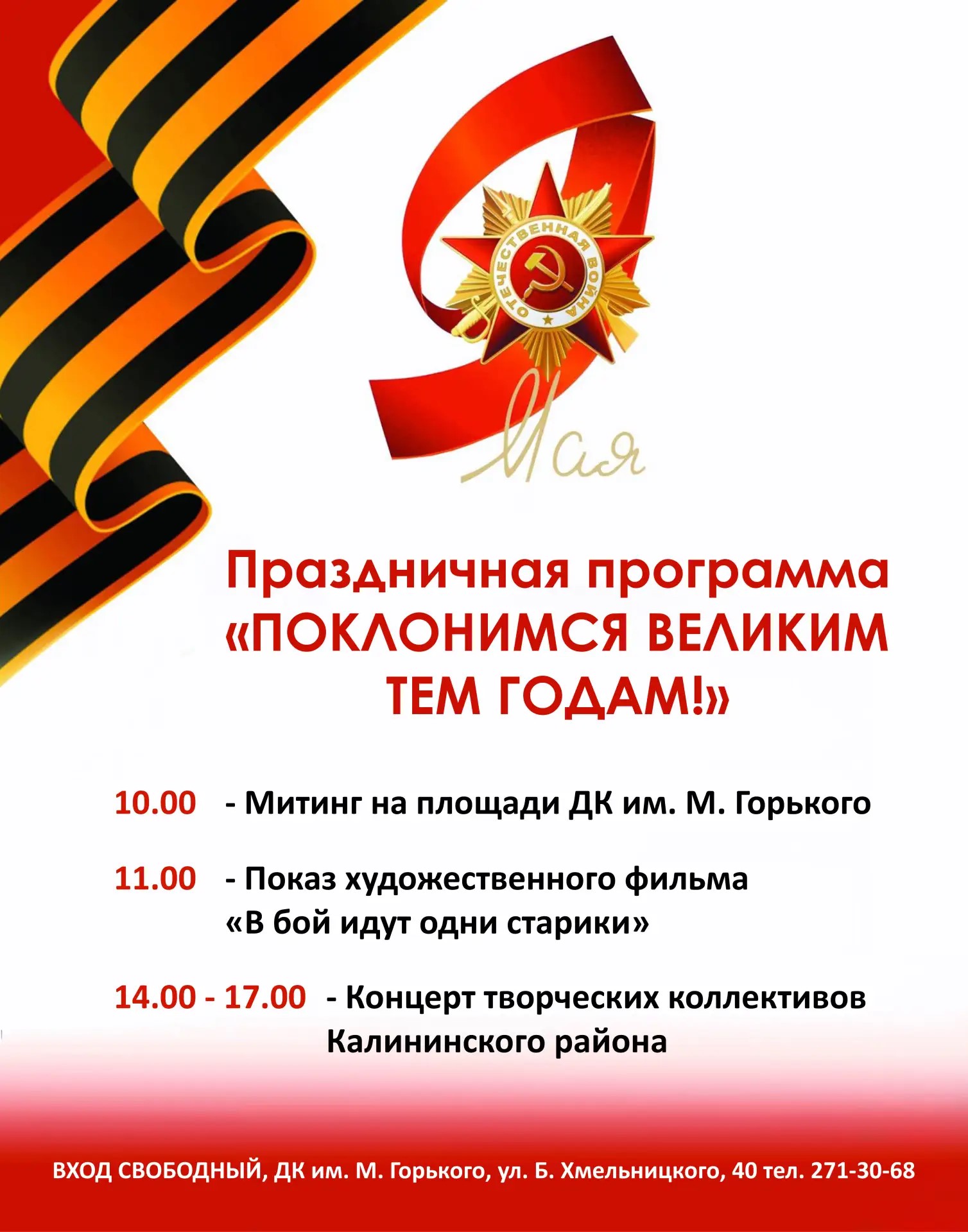 Концерт творческих коллективов Калининского района, посвященного Дню Победы в Великой Отечественной войне 1941-1945гг.Вход свободный.